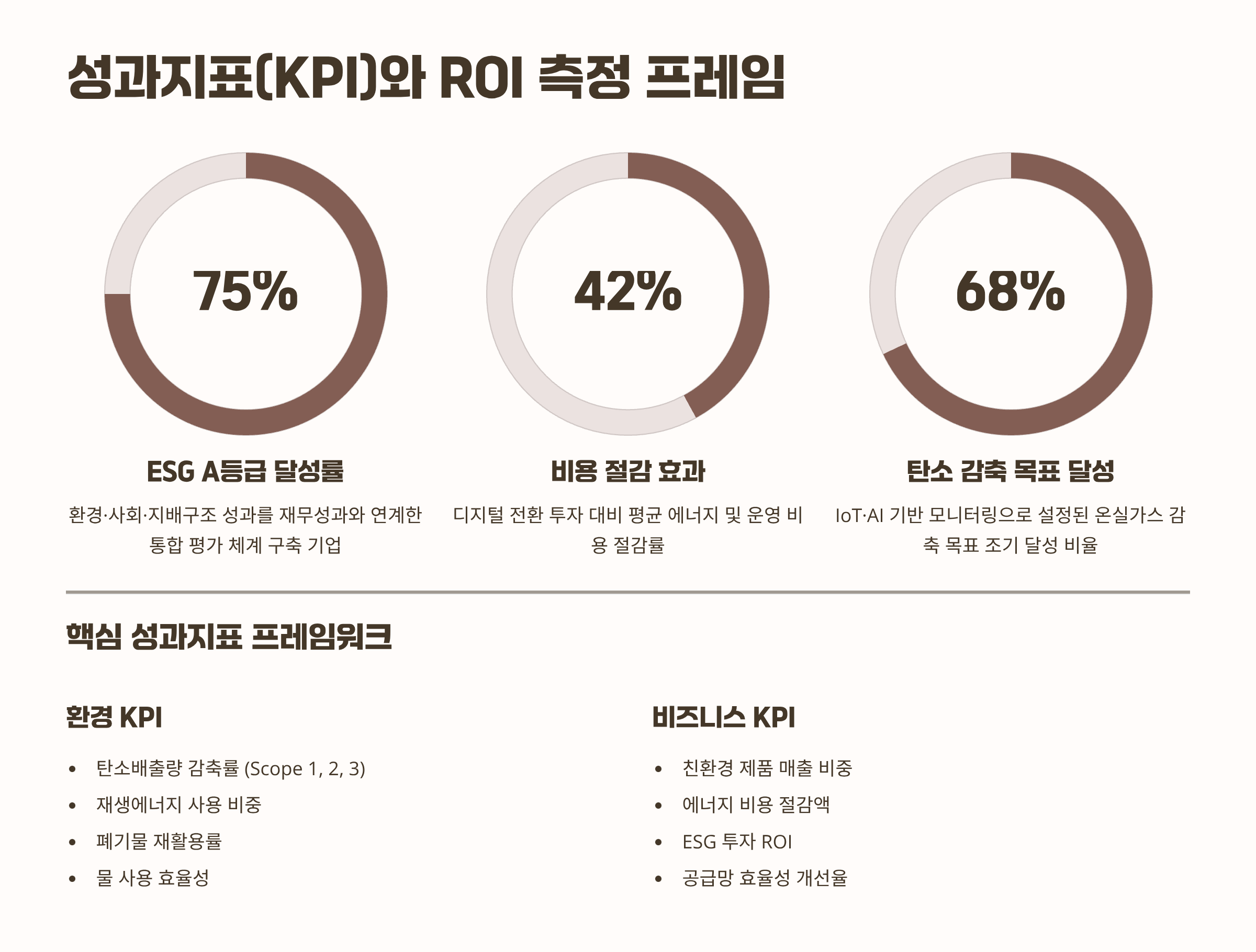 경영진을 설득하려면 ‘감축 톤수’만으론 부족해요. 에너지 비용, 다운타임, 재고회전, 고객 유지율 같은 경영 KPI에 연결해야 합니다. HBR는 지속가능 목표 달성을 위해 조직·비즈니스모델 전환이 필수라고 강조합니다. 이는 KPI 설계를 기술 투자와 나란히 재설계해야 함을 뜻해요.