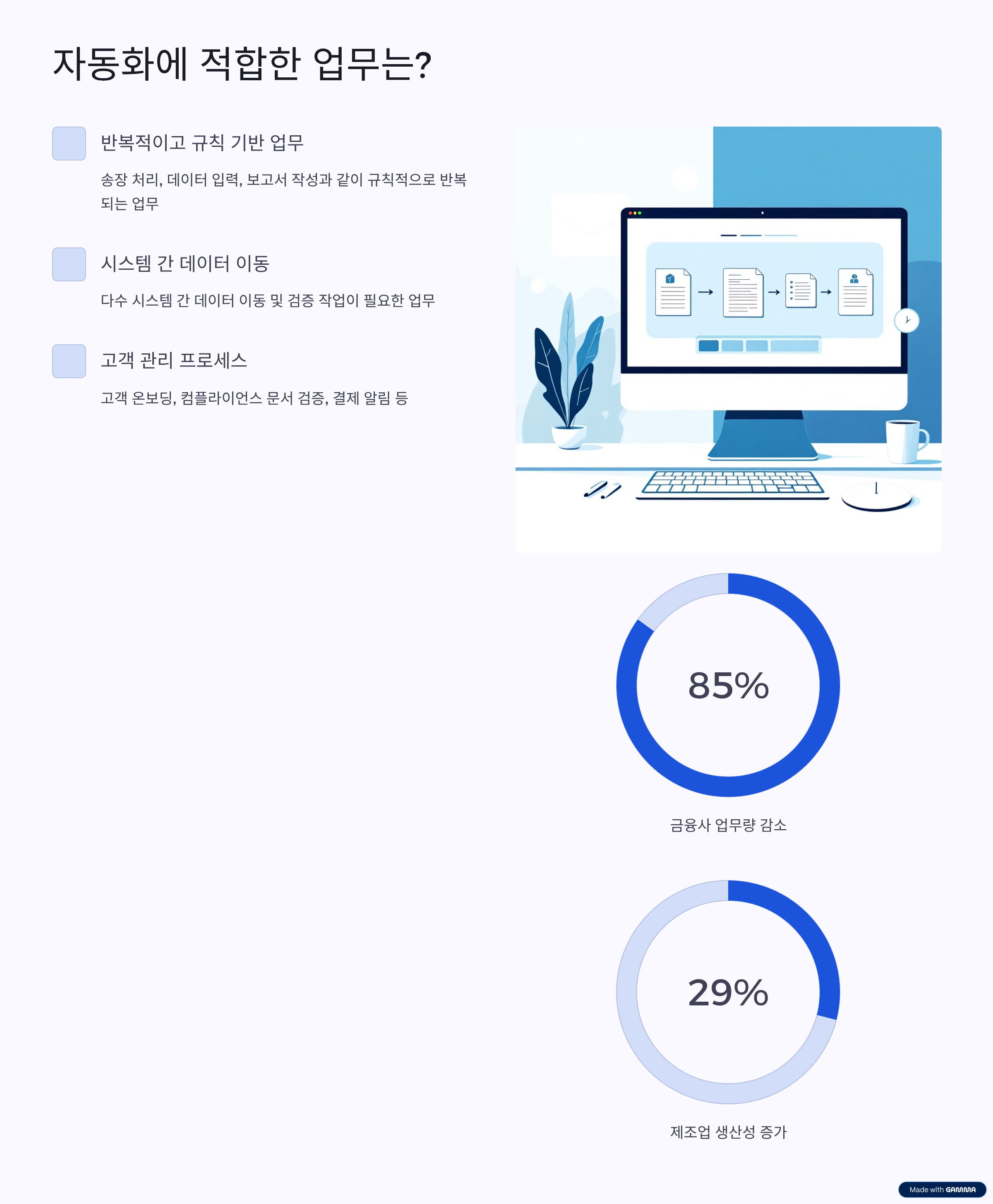 모든 업무를 한꺼번에 자동화하려 하지 말고, 작고 단순한 작업부터 시작해야 합니다. 또한, 기존 프로세스를 먼저 정비하는 것도 중요합니다.