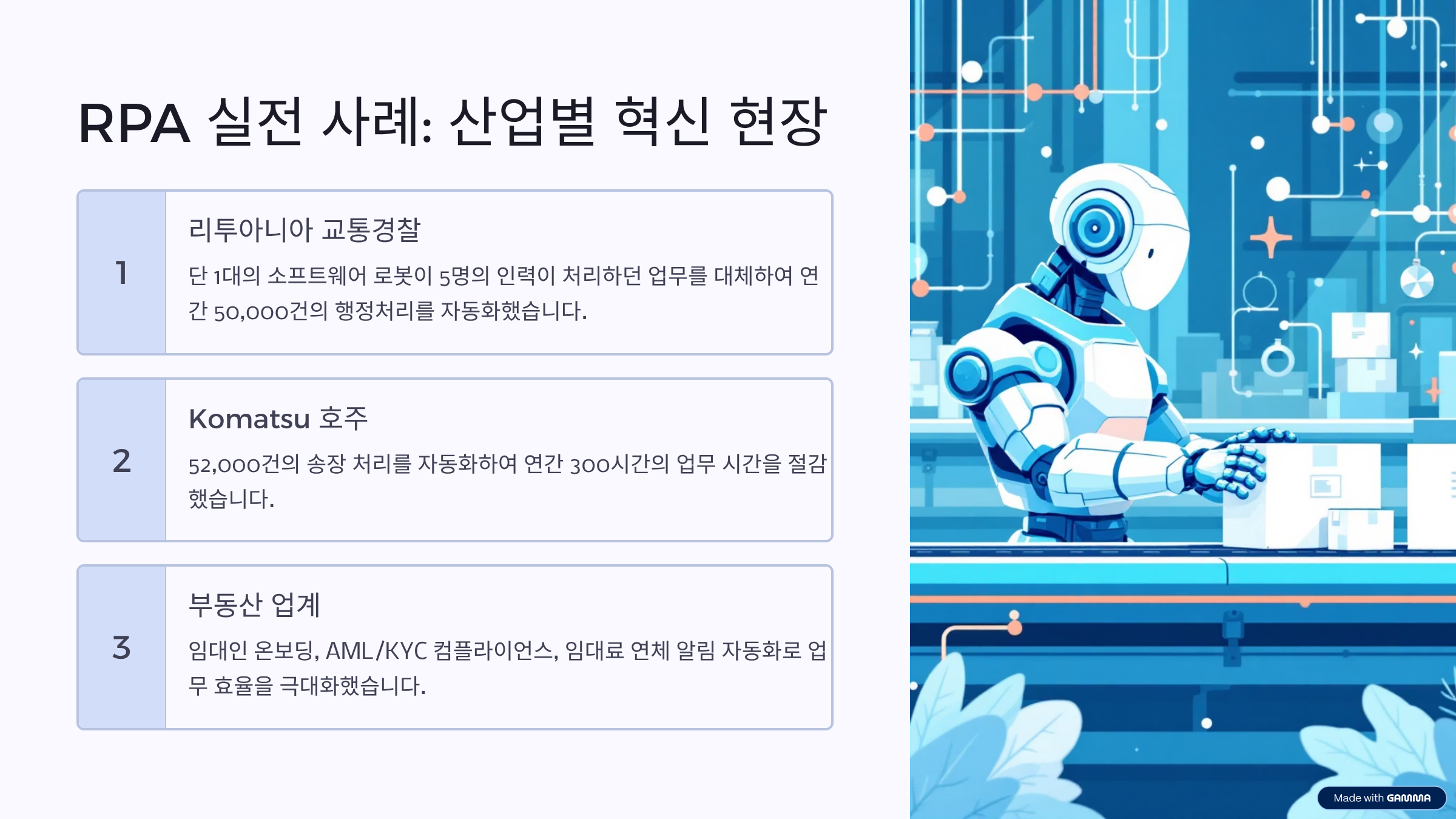 RPA는 거의 모든 반복적 사무 업무에 적용할 수 있습니다. 특히 사내 보고서 자동화, 정기 메일 발송, 고객 정보 등록, ERP 입력, 재무 보고 등에서 그 효과가 큽니다. 아래 표는 다양한 실전 적용 사례입니다.