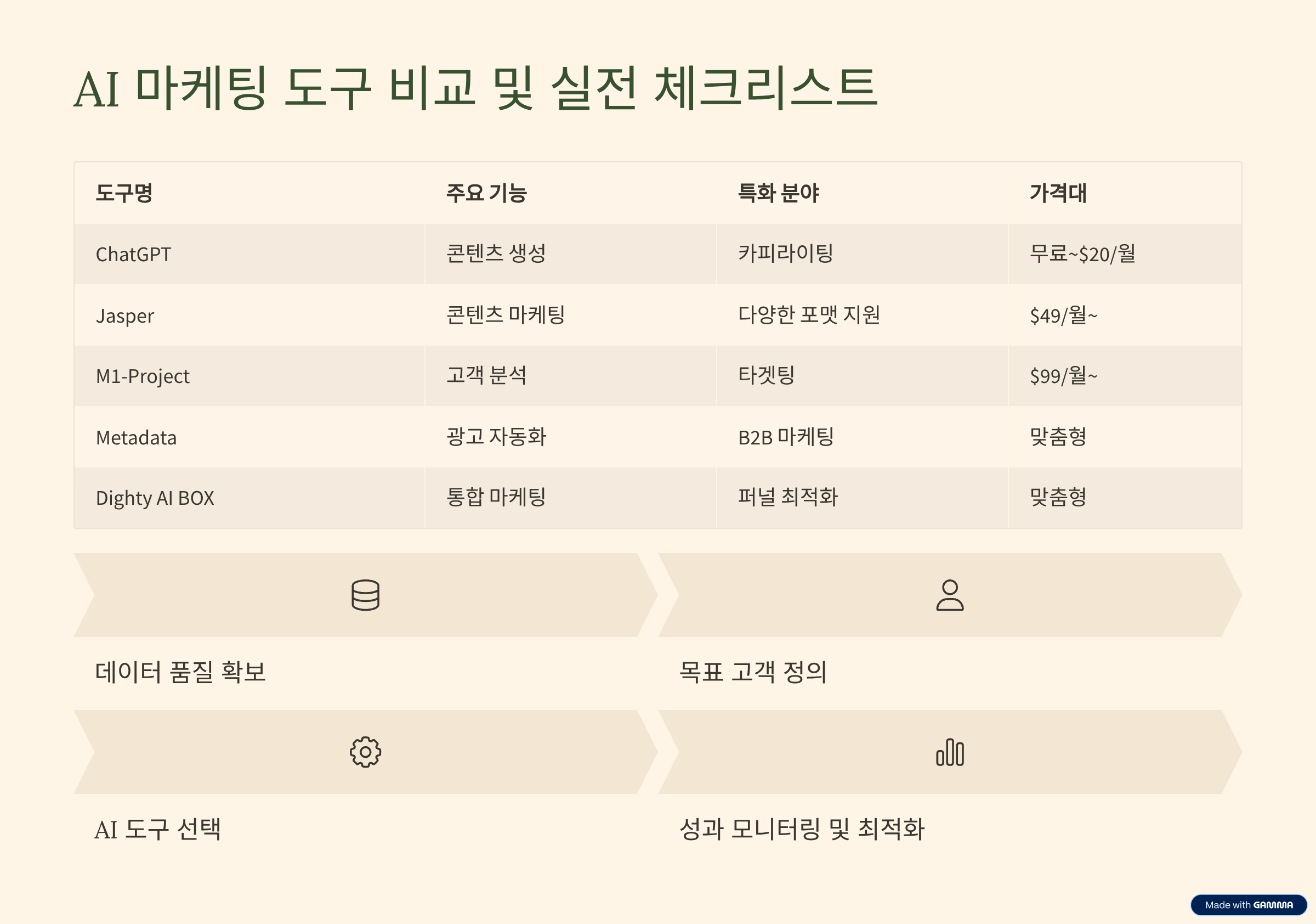 이 체크리스트만 따라도, AI 마케팅의 기본 골격은 완성됩니다. 시작은 작게, 개선은 꾸준히—그게 핵심이에요.