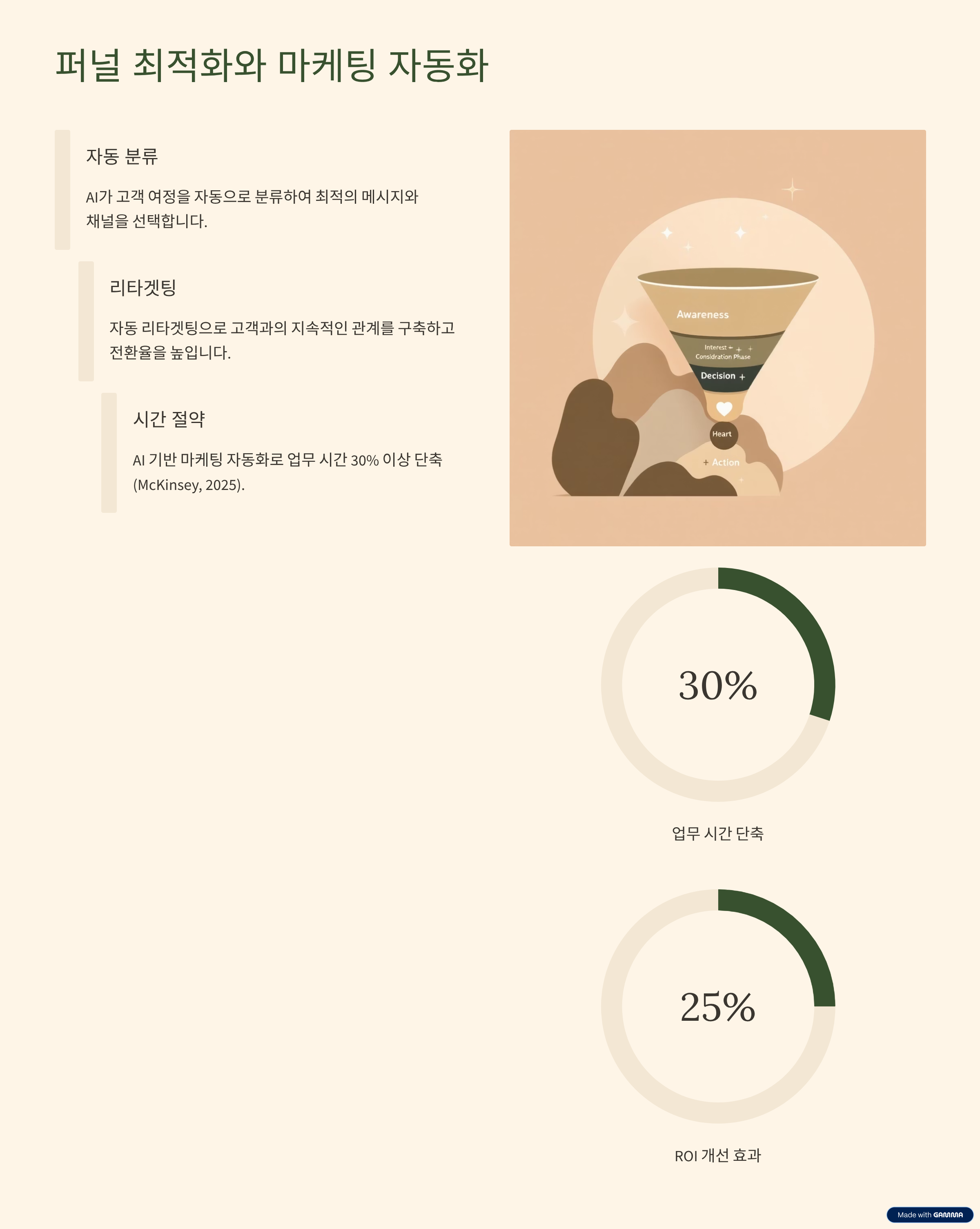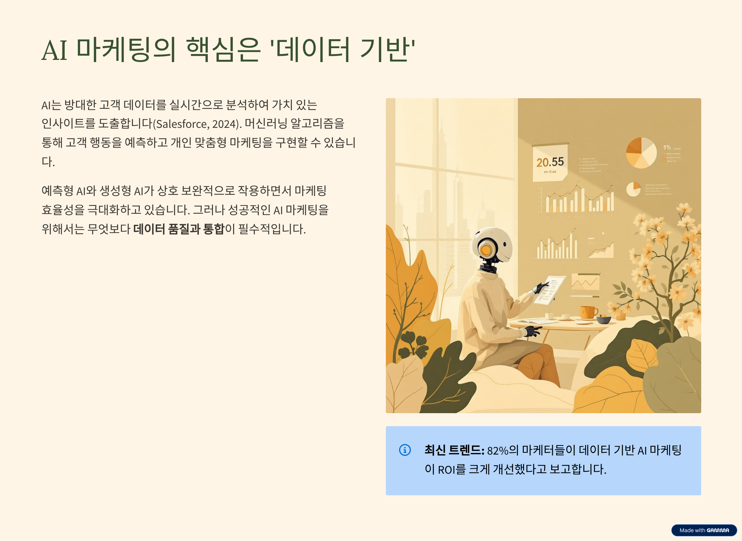 AI 마케팅은 데이터 기반 타겟팅, 퍼널 최적화, 자동화 도구 활용을 통해 마케팅 성과를 극대화하며, 중소기업도 쉽게 도입할 수 있는 효율적인 전략입니다.