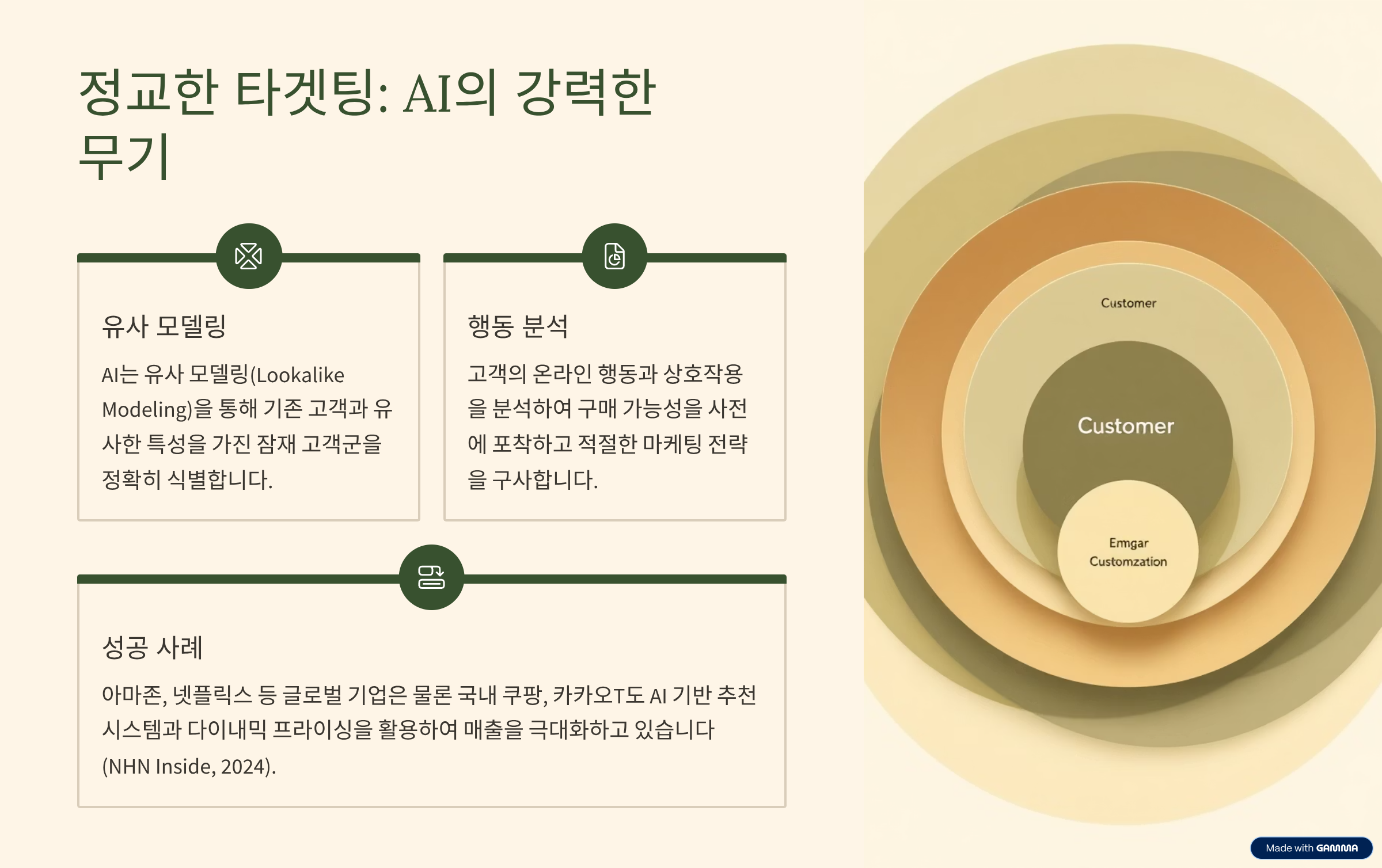 타겟팅이란 마케팅의 기본이죠. 하지만 AI가 개입하면 그 수준이 완전히 달라져요. 단순히 연령, 성별 같은 인구통계학적 기준이 아니라, 구매 시점, 행동 패턴, 콘텐츠 반응까지 모두 고려한 ‘개인화’ 타겟팅이 가능해지는 것이에요.